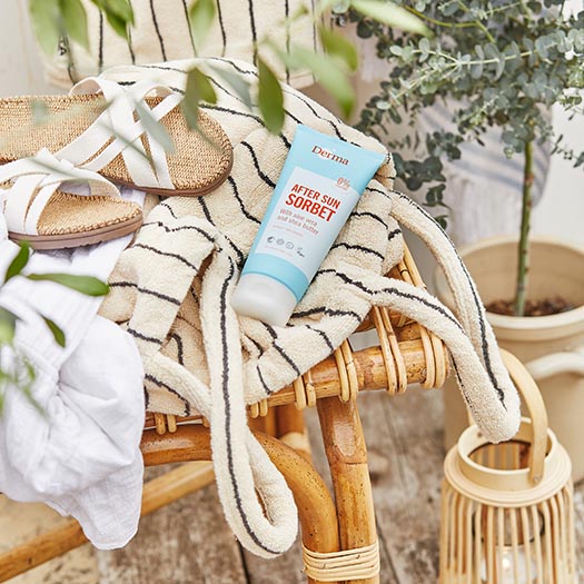Fordel Derma After Sun Sorbet på kroppen, og lad den trænge ind i huden. Solbadning virker udtørrende på huden, så brug derfor altid rigelig mængde Derma After Sun Sorbet efter solbadning. Før solbadning brug altid Derma Sun Lotion med den solfaktor, der passer til din hud.